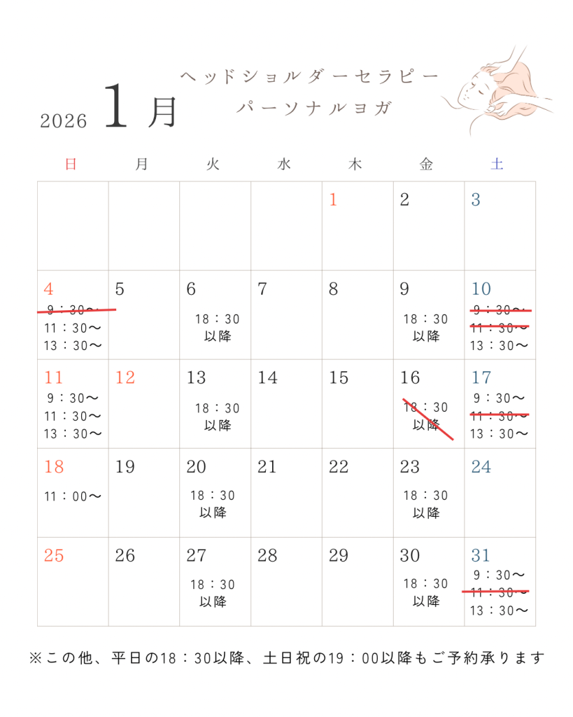 2024-07-24 / 最終更新日 : 2026-01-01 yoga.a.m.d.s Uncategorized ヘッドショルダーセラピースケジュール 公式ラインよりご予約をお願い致します。ラインはお友達登録後『ヘッド』とお送りください。折り返しメッセージをさせていただきます☺ LINE:@994twowx